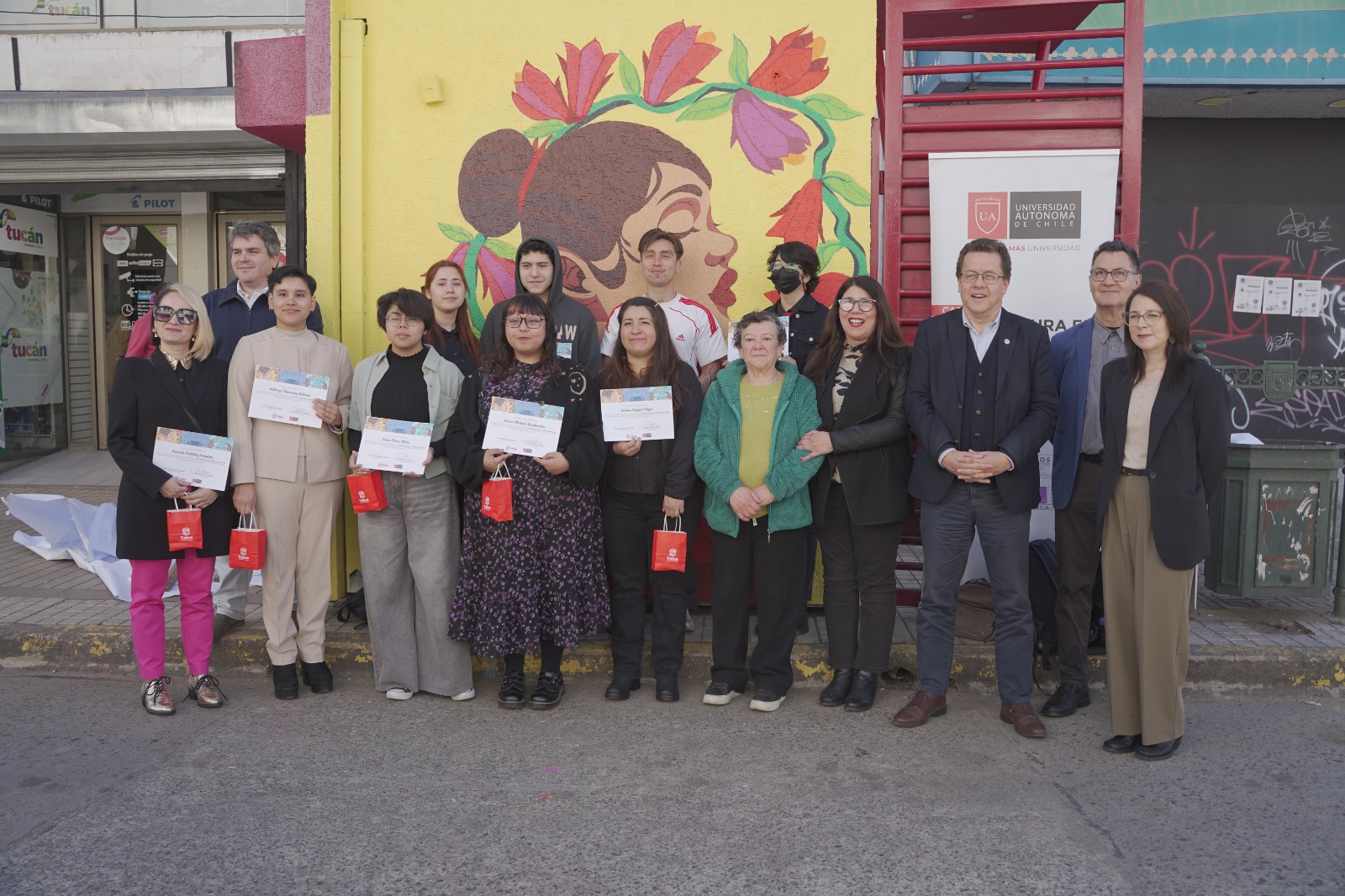Por su parte, Marcelo Cevas, vicerrector de la Universidad Autónoma de Chile- sede Talca, explicó que “el objetivo fue hacer este arte mural, traspasarlo a la ciudadanía a través de tres quioscos que se encuentran ubicados acá en el centro de la ciudad de Talca y con eso contribuir no solamente al arte, sino a la vinculación con el medio que nos rodea y también con el embellecimiento de la ciudad que tiene que pensar en ir proyectándose como un destino turístico a futuro”.