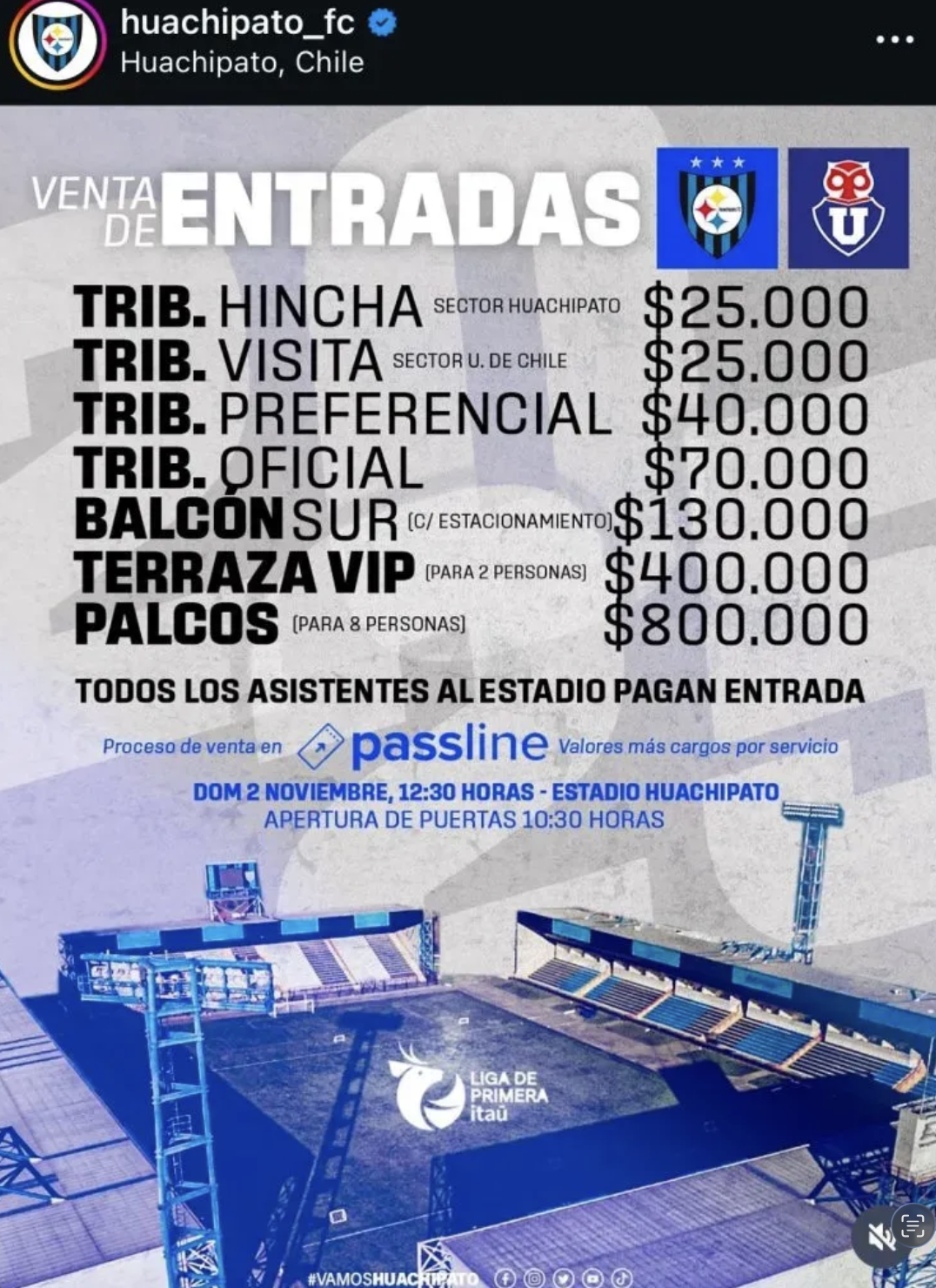 Una fuerte polémica desató Huachipato tras publicar los valores de las entradas para su próximo partido contra Universidad de Chile, válido por la fecha 26. El duelo, programado para este domingo 2 de noviembre a las 12:30 horas en Talcahuano, tiene precios que alcanzan los $800.000 pesos, generando la furia de los hinchas.